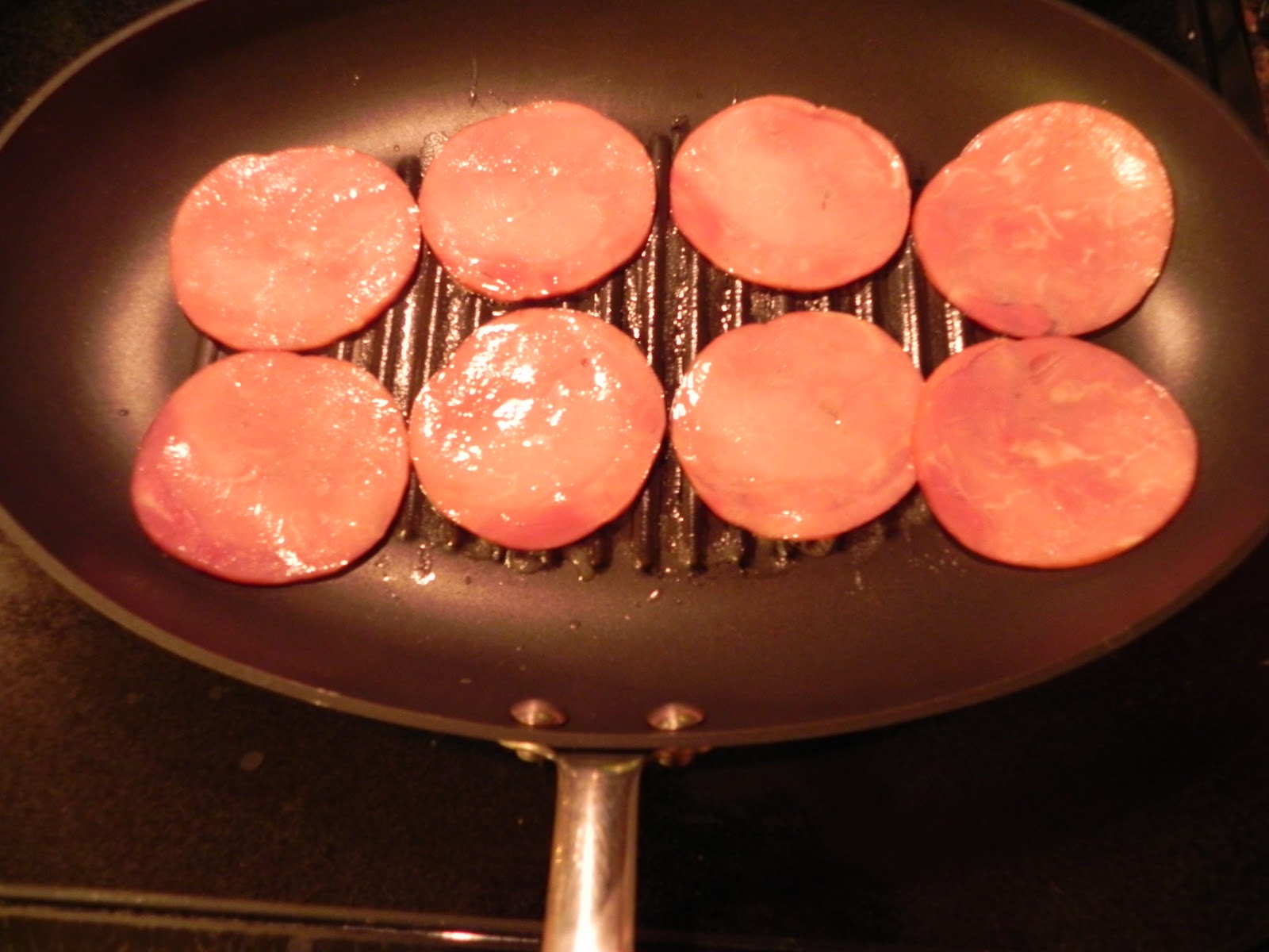 Pre-heat oven to 375 degrees. Melt 1 tablespoon of butter in your skillet. Heat the canadian bacon just until lightly golden (they are pre-cooked). Remove and set aside.